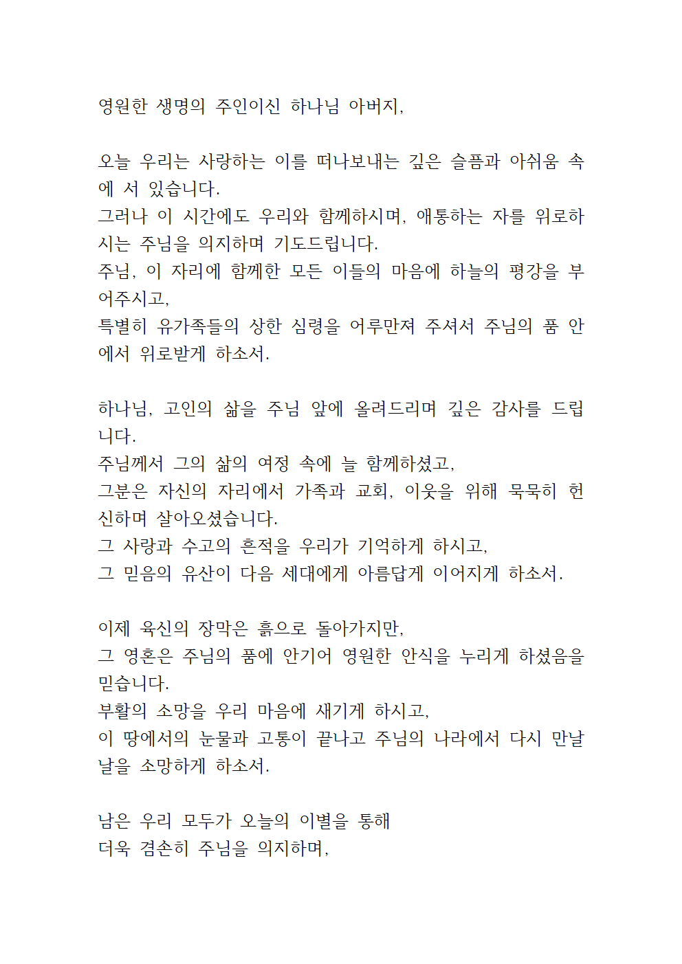 모든 장례 절차 위에 주님의 질서와 평안이 머물게 하시고, 우리의 슬픔을 기도로 승화시켜 주님께 가까이 나아가게 하소서.